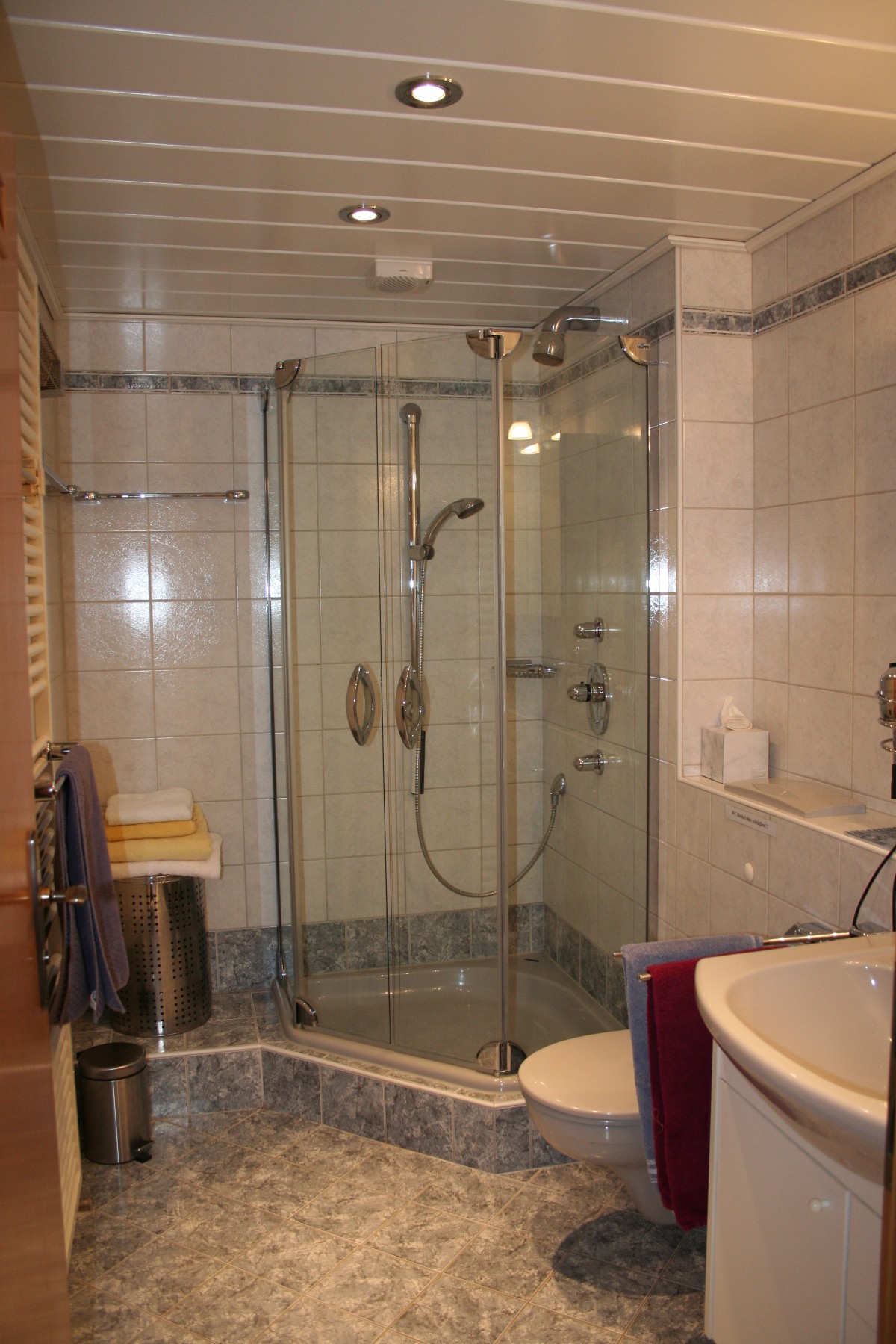ist modern ausgestattet mit einer großen Dusche, Handwaschbecken mit Unter-